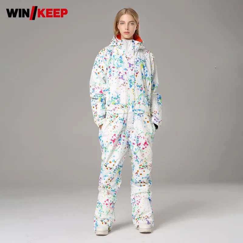 TOP Women Winter Outdoor Conjoined Skiing Suit Printed Waterproof Skiing Equipment Set Hoody Snowboardi